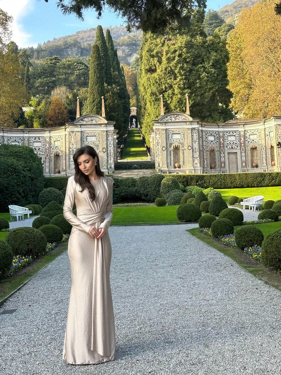 Elegant evening gown made of shimmering satin fabric, featuring long sleeves, a fitted silhouette, and delicate draped details at the waist. The floor-length design adds sophistication, while subtle embellishments provide a touch of glamour, making it perfect for formal events and special occasions.